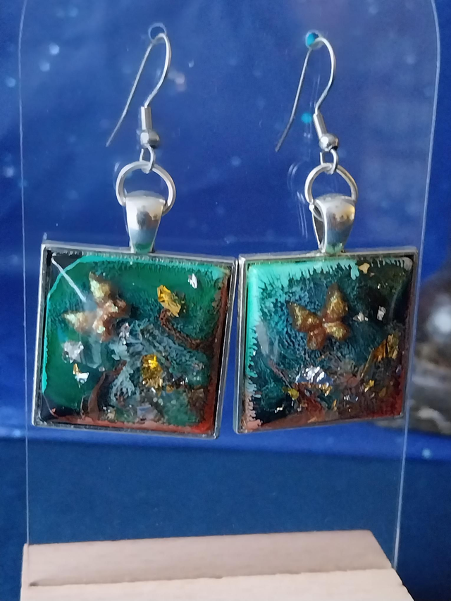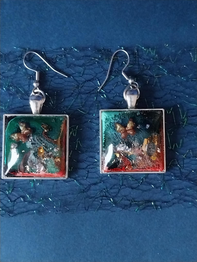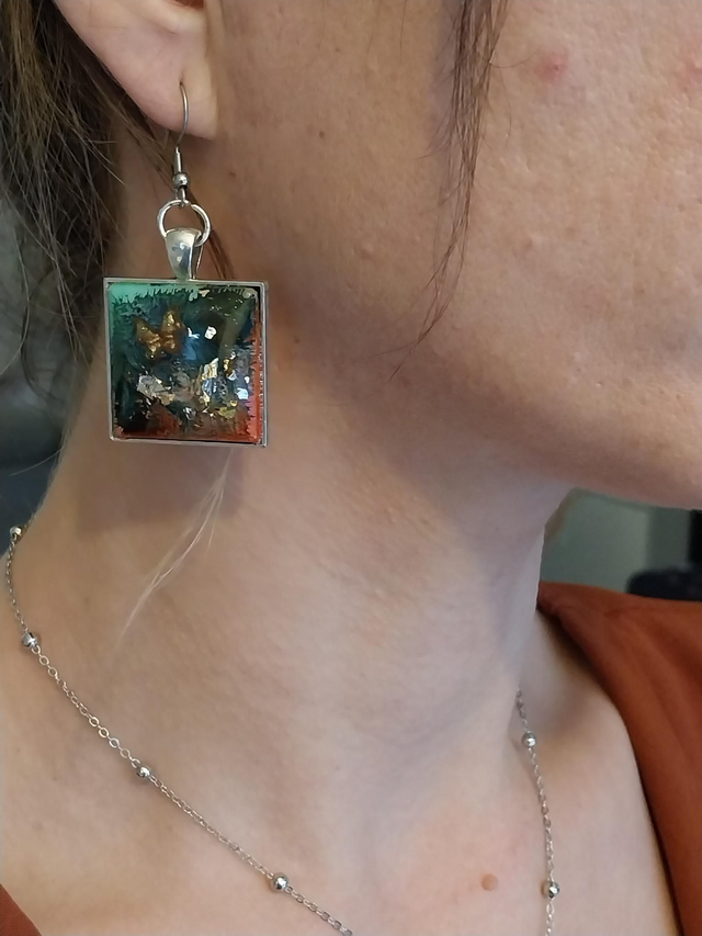 Jardins d’Émeraude renferment cet éclat de nature magique. Ces boucles d’oreilles en résine capturent des reflets verts profonds et des éclats dorés, évoquant la mousse scintillante, l’or ancien et la lumière filtrant à travers une forêt enchantée. Leur forme carrée symbolise l’ancrage et la stabilité, tandis que chaque nuance rappelle un fragment de rêve préservé.