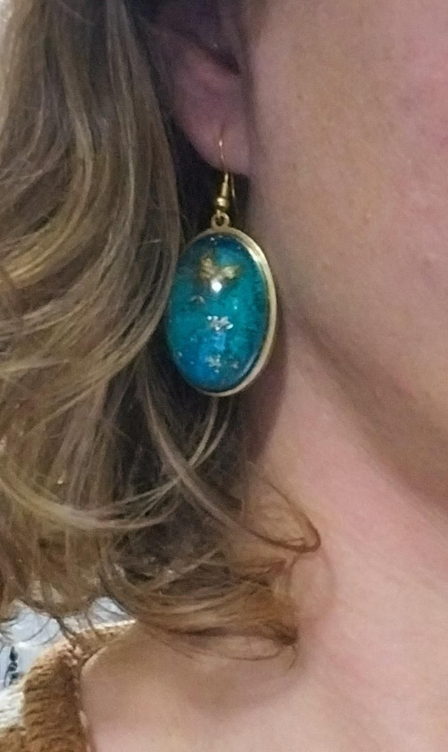 Sous le voile bleu nuit du ciel endormi, une lueur turquoise s’élève à l’horizon. C’est l’instant sacré où la nuit rencontre l’aurore, là où naît Aurora, première lumière du rêve. De ce souffle d’étoile émergent deux ailes d’or, fragiles et étincelantes, venues se poser dans un fragment de ciel figé dans la résine.