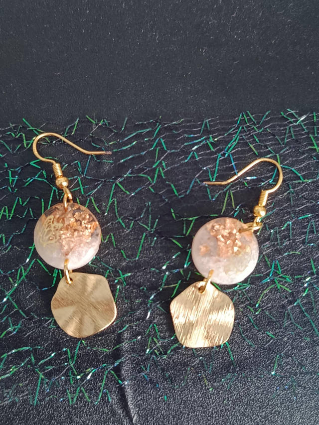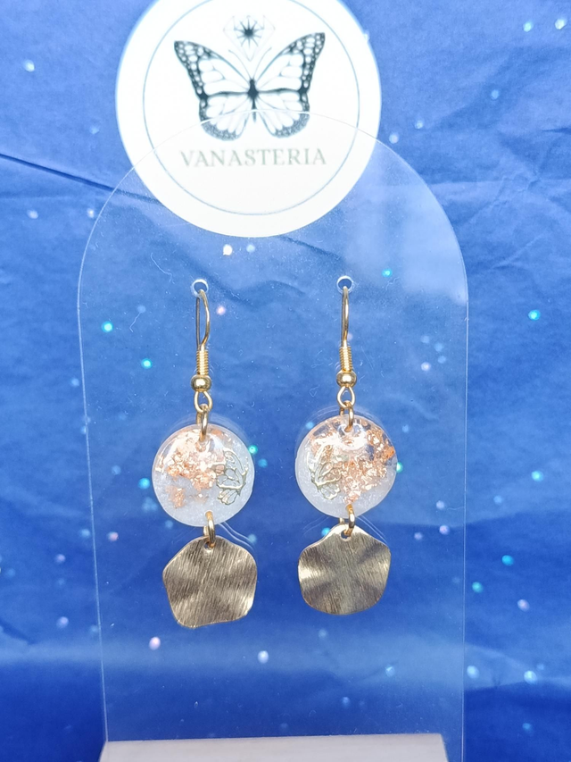 Ces boucles d’oreilles artisanales en résine capturent l’éclat du premier soleil, comme un fragment d’aube figé dans la matière. Les formes ailées et les reflets dorés évoquent la métamorphose, la renaissance et l’élan vital. Chaque détail invite à embrasser le changement avec grâce et confiance.