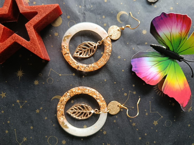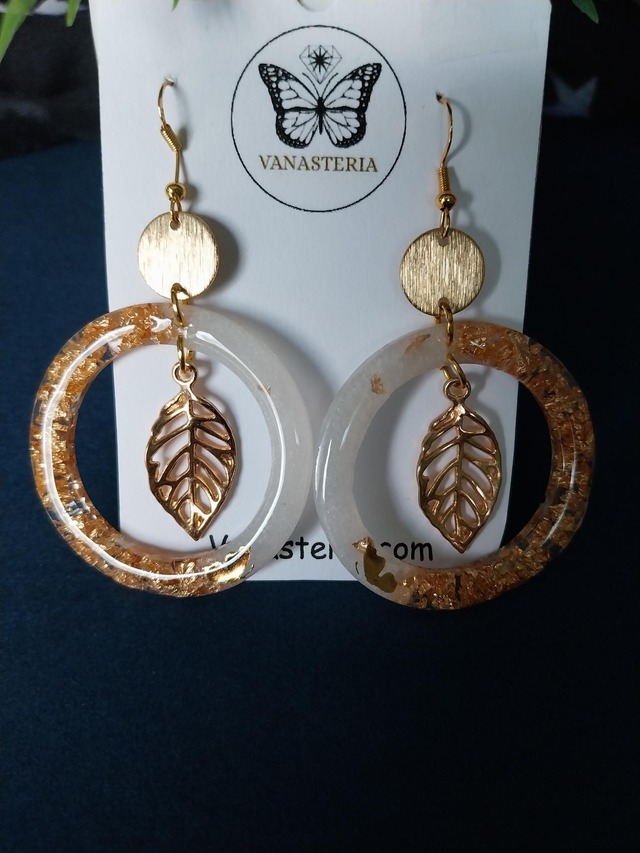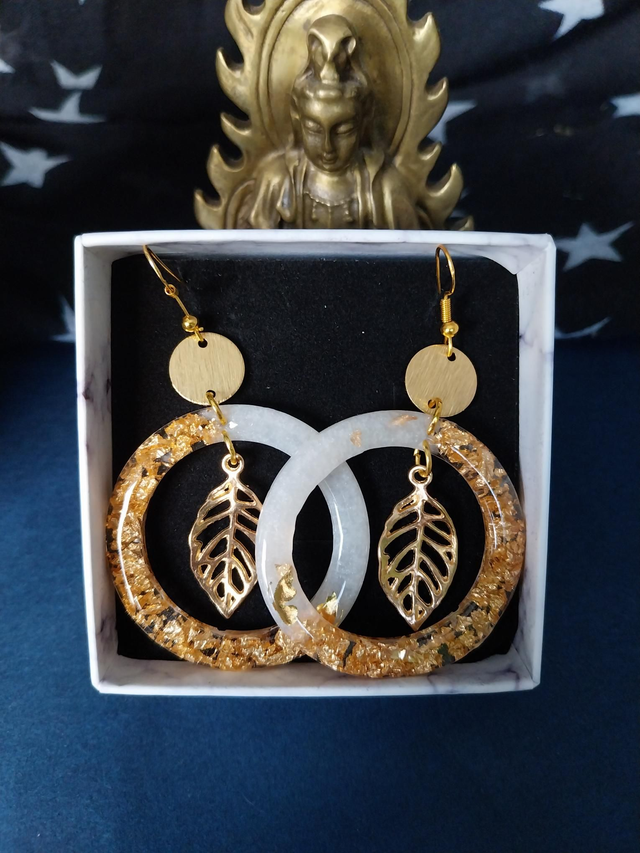 Les Feuilles d’Orée sont des boucles d’oreilles artisanales en résine, renfermant des fragments dorés semblables à des feuilles solaires figées dans le temps. Leur forme organique évoque l’ancrage, la croissance et l’harmonie entre nature et lumière. Chaque détail invite à la reconnexion, à l’équilibre et à la transformation douce.