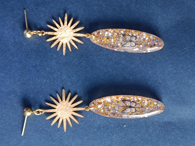 Ces boucles d’oreilles en résine capturent des éclats dorés semblables à des fragments de soleil, sertis dans une matière claire et lumineuse. Les formes solaires texturées diffusent une énergie d’expansion, de confiance et de vitalité. Chaque mouvement rappelle que la lumière ne cherche pas à convaincre : elle rayonne simplement.
