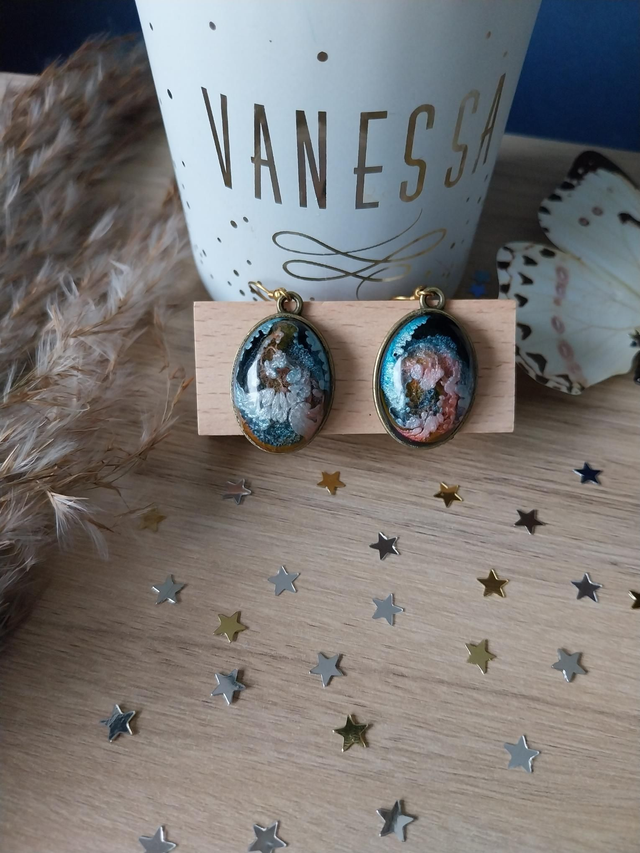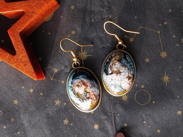 Façonnées à la main, ces boucles semblent porter la mémoire d’un ciel ancien, celui des nuits calmes où les étoiles chuchotent. Chaque paire est unique, née du hasard et du geste, comme un nuage qui ne se reproduit jamais à l’identique.