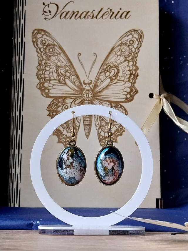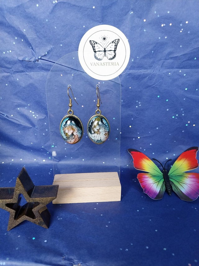 Chaque cabochon ovale renferme un fragment de ciel assoupi, figé sous une résine lumineuse comme un murmure de lumière. Les pigments s’y fondent lentement — bleus profonds, roses voilés, ombres d’éclipse — dessinant des nuées silencieuses et des horizons oniriques.