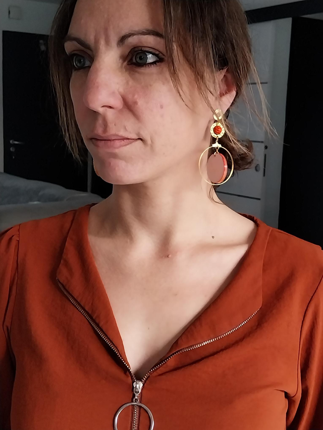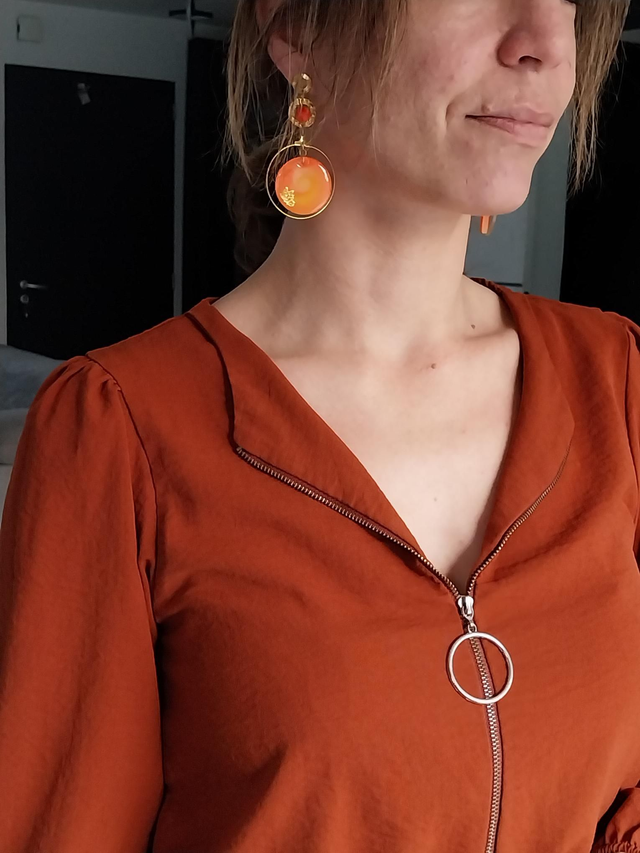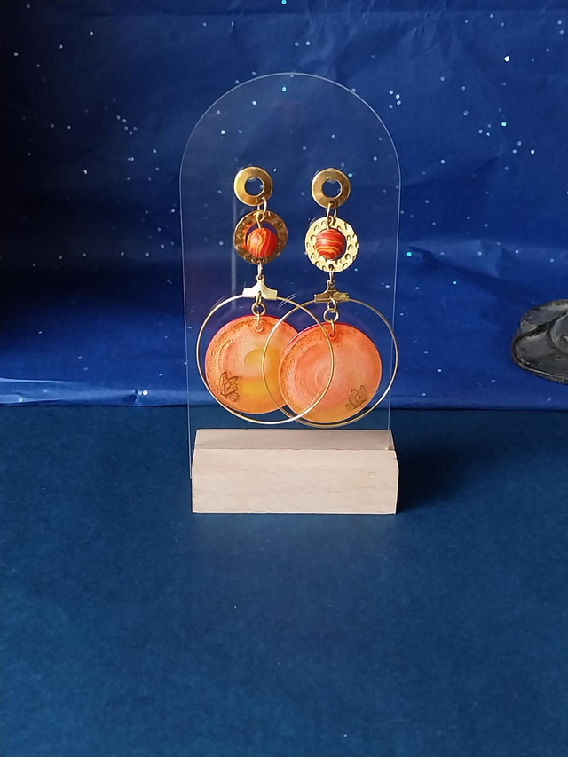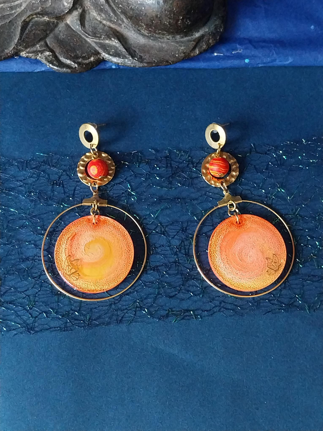 Boucles d’oreilles aux nuances solaires d’orange et d’or, cerclées de lumière et animées d’un cœur spiralé.