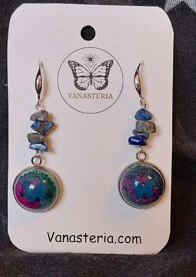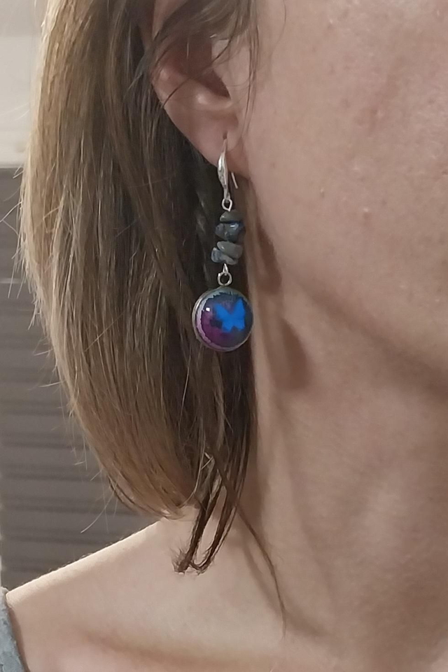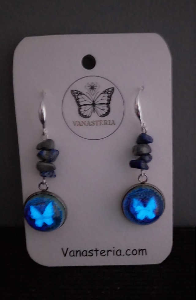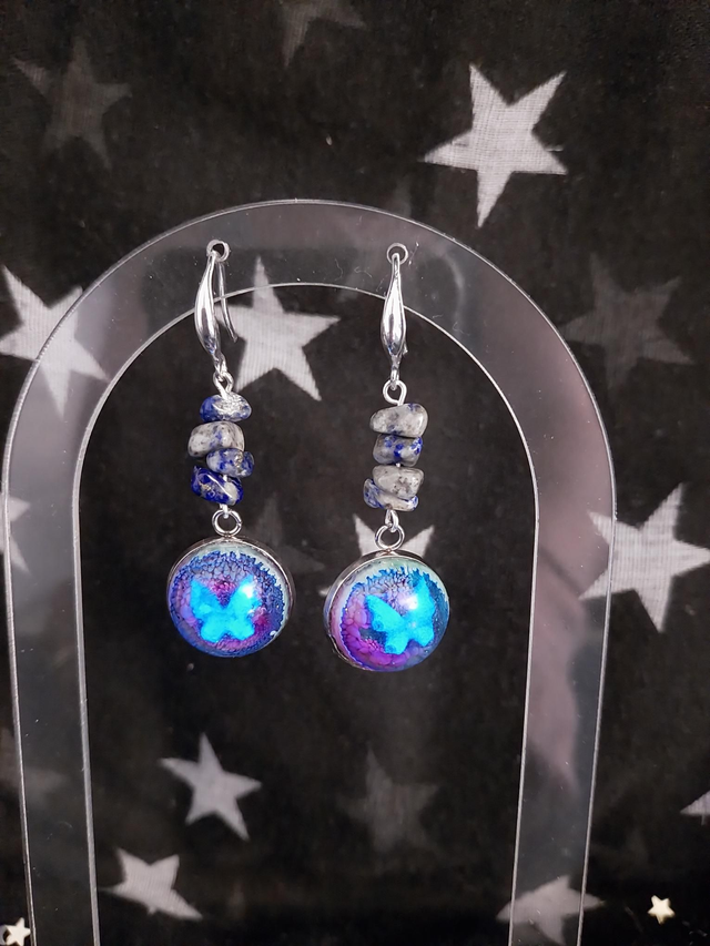 Montées sur créoles délicates et ornées de pierres naturelles de lapis-lazuli, ces boucles d’oreilles évoquent une pluie de lumière suspendue. Les étoiles renferment un secret : un papillon lumineux qui apparaît sous la lumière UV, tel un symbole de l’âme cachée, prête à se révéler à celles qui savent voir l’invisible.
