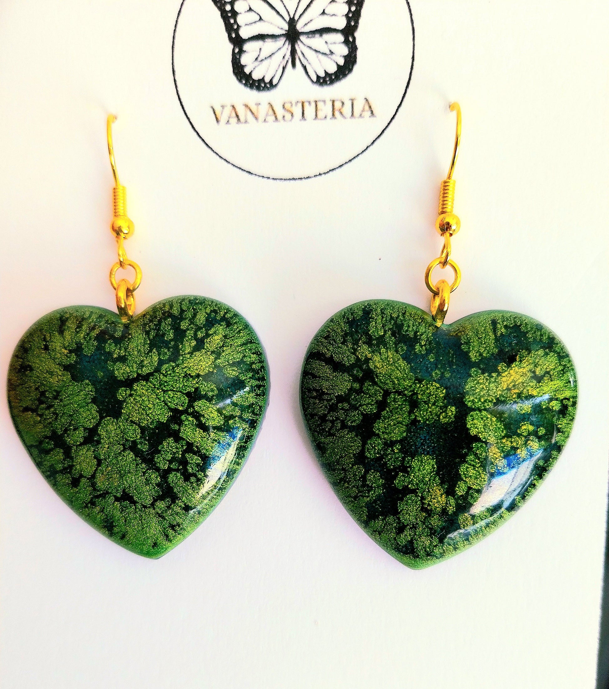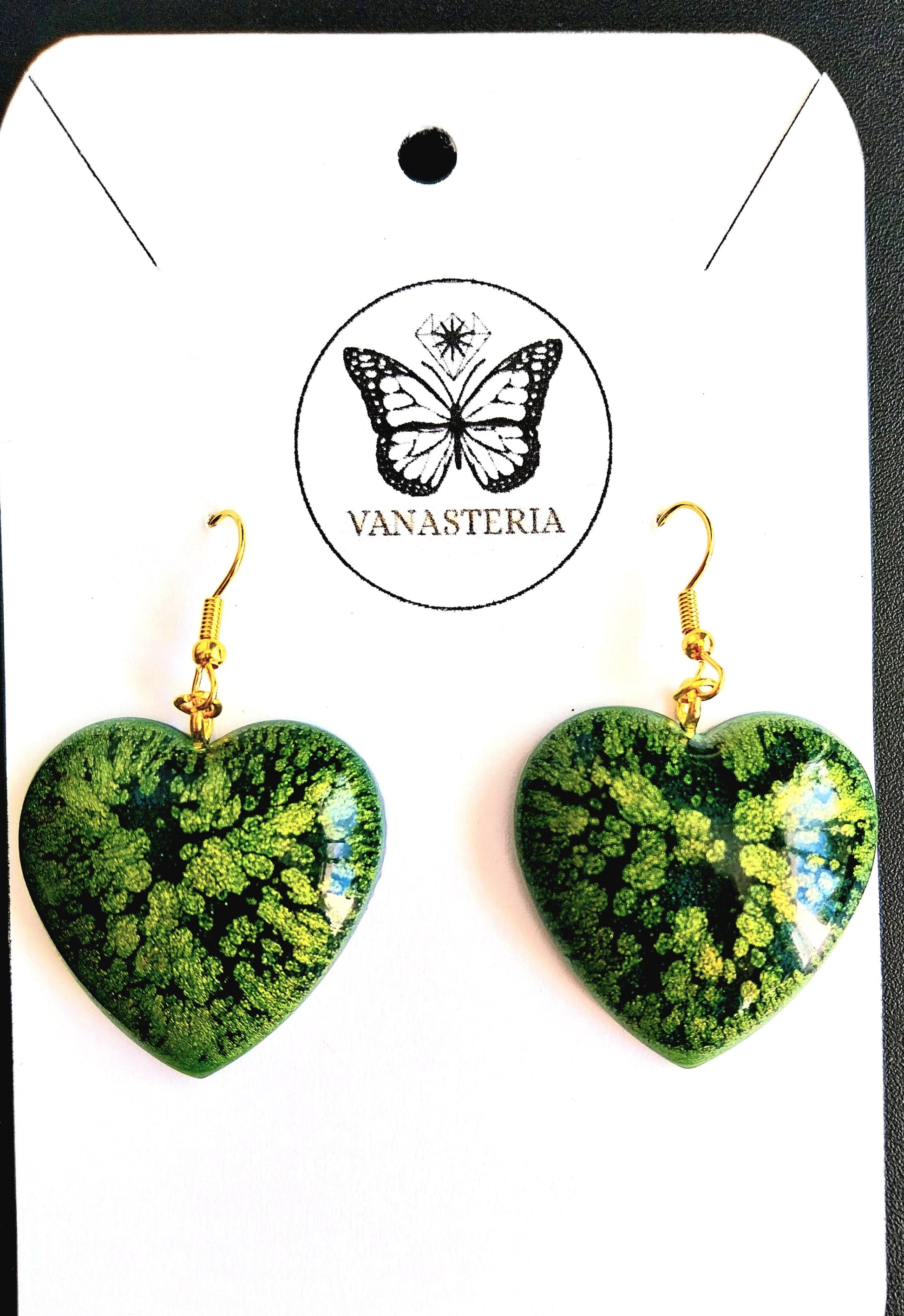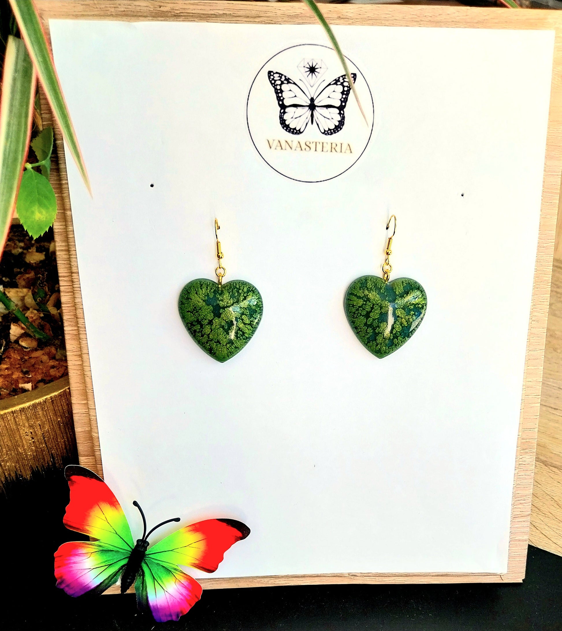 Laissez-vous séduire par ces boucles d'oreilles en forme de cœur, faites main en résine époxy, où chaque pièce renferme un monde végétal miniature aux reflets enchanteurs.