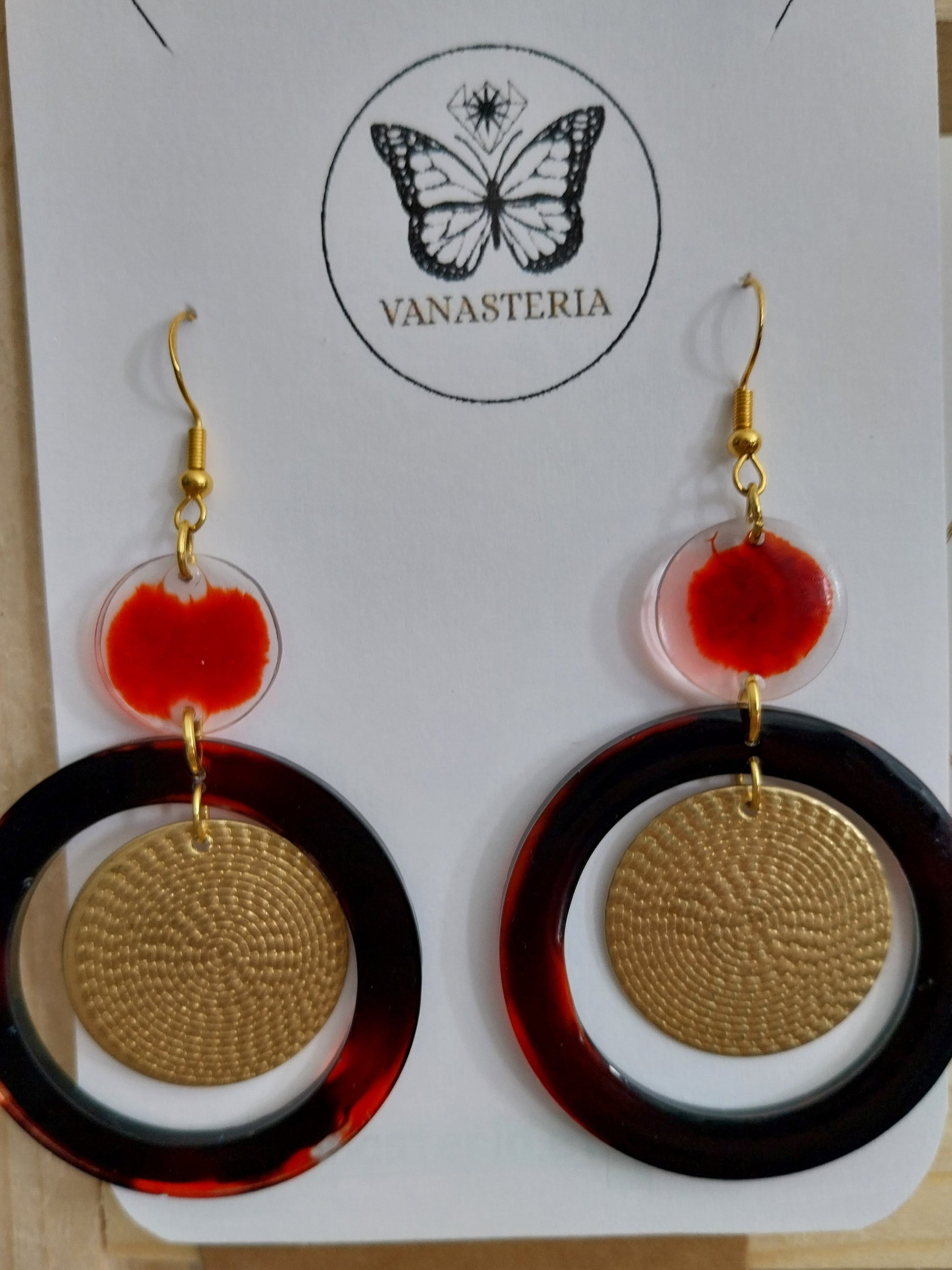 Elles se composent d'un disque doré texturé , encadré par un grand anneau effet écaille brun-rouge , surmonté d'un petit médaillon en résine transparente et rouge feu .