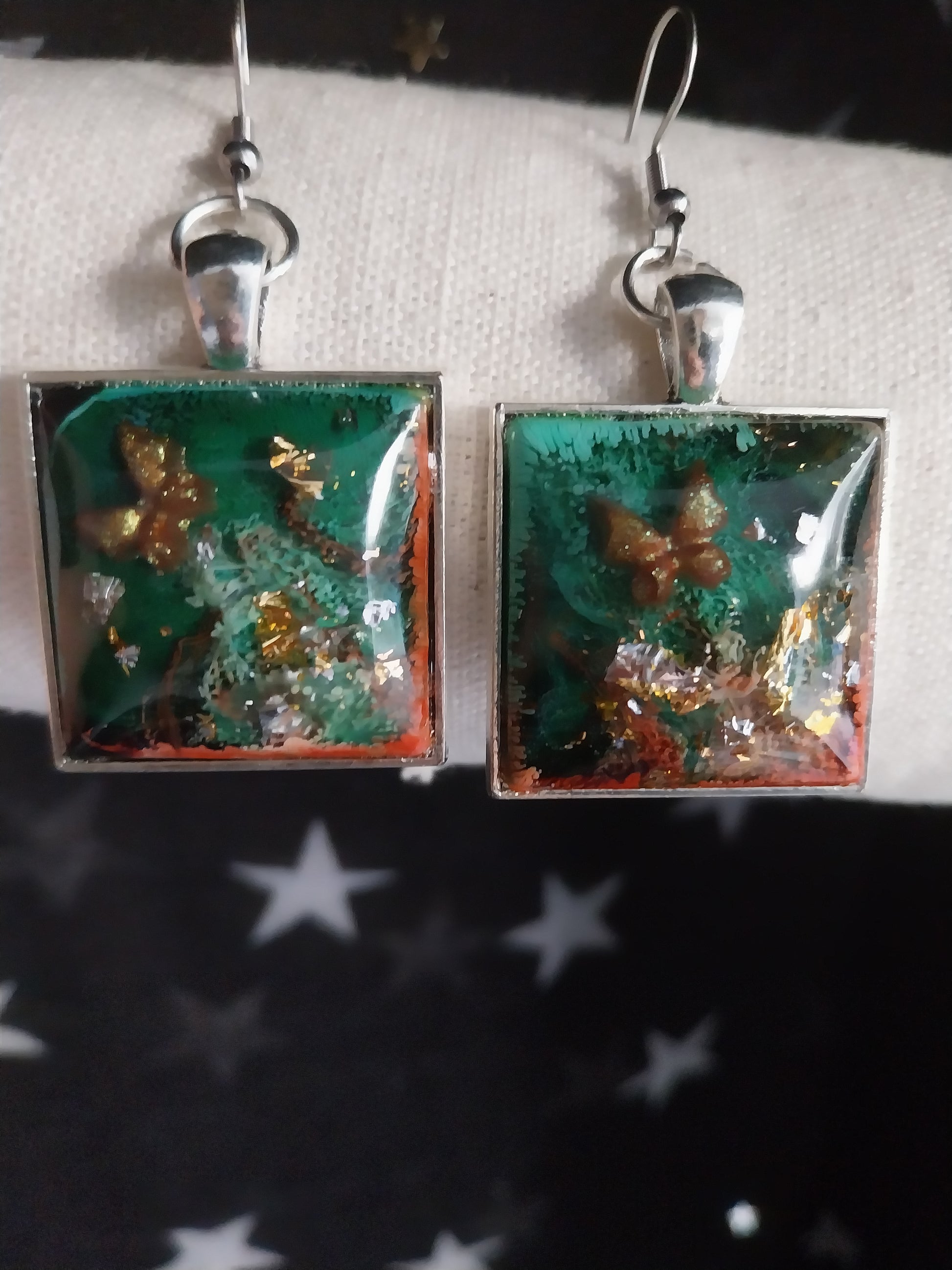 Ces boucles d’oreilles carrées, créées à la main dans l’atelier Vanasteria, renferment des éclats dorés et verts profonds, évoquant les mousses scintillantes et les ailes de papillons perdus dans les forêts des songes.